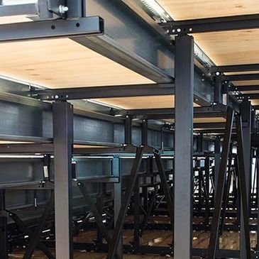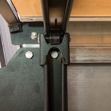 Cantilever deck support arms are double-formed, heavy-duty, 12 gauge steel welded to the row posts. Adjacent row posts, that the cantilever deck supports rest on, are capped with nylon pads to prevent metal-to-metal contact and eliminate the need for lubrication.